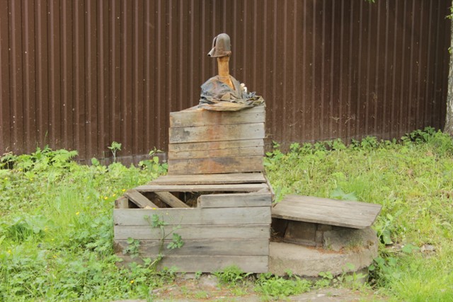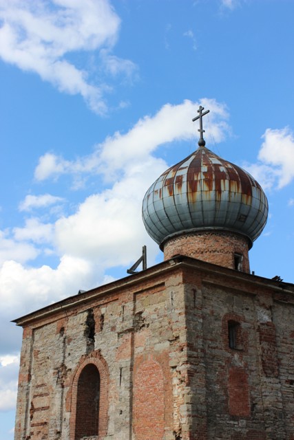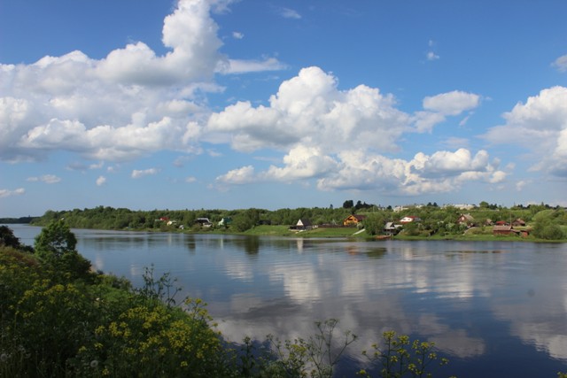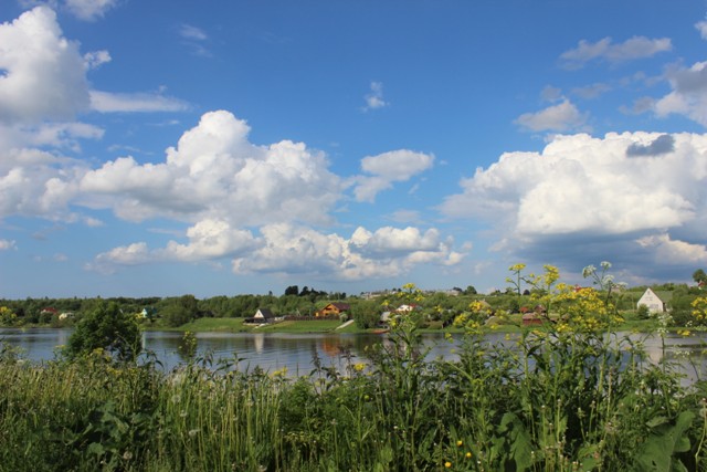 Особого плана, что посмотреть, у нас нет, думали дойти до кургана, где погиб вещий Олег от укуса змеи супостатской, но дойдем ли? Много курганов на другой стороне Волхва, бабушка из музея рассказала, что можно договориться с рыбаками и переплыть. Но вообще-то там просто поля, и ничего интересного мы не увидим. Кстати в музее у почты очень интересная коллекция рукоделия — вышивка и особенно удачные смешные коты! А пока идем прямо.