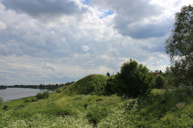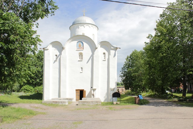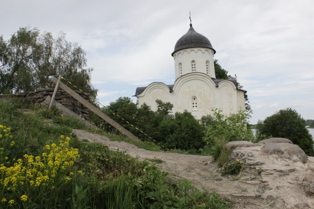 Церквушка стоит прямо на берегу Волхова. Оттуда мы видим курганы, под одним из которых вещий Олег!