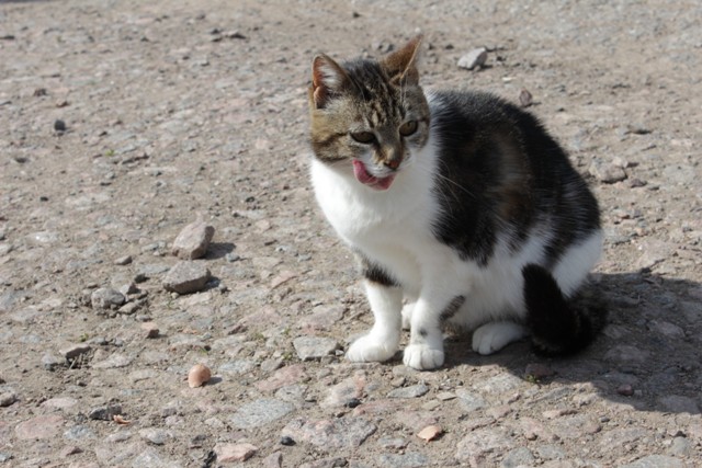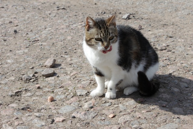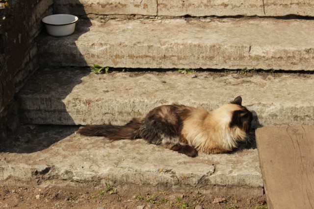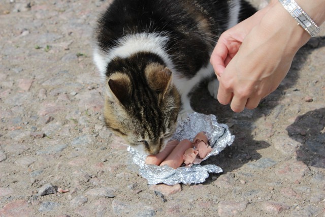 В церквушке бродит беременная кошка, ну как не покормить, тем более с пикника остались сосиски. Кормим