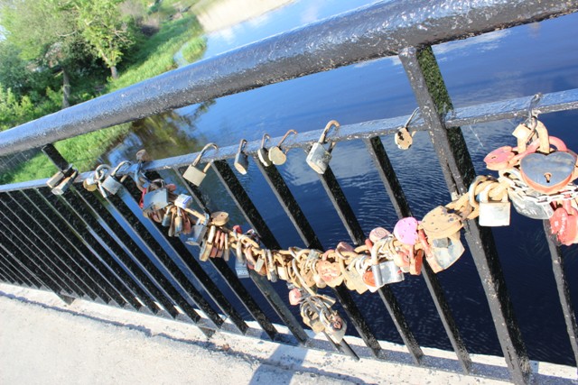 Вот мы видим крепостную стену, значит, надо покидать автобус. На мостике через реку Елена- куча замков. Видимо, это место для свадеб.