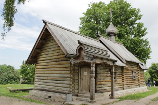 Увы, погода стала пасмурной, но нас это не пугает. Волхов выглядит суровым, а на территории замка — церквушка и роскошный домик из бруса. (Забегая вперед скажу, что солнце и солнечные фотографии будут через полчаса)