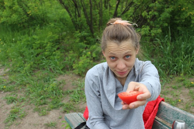 Юля угощает помидорами и кокетливо заманивает — )