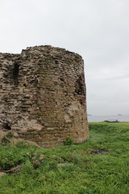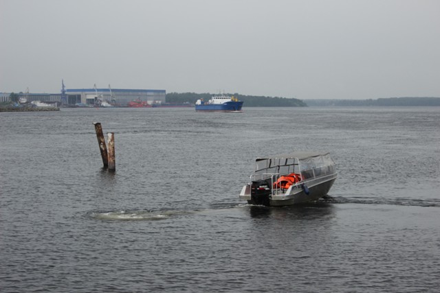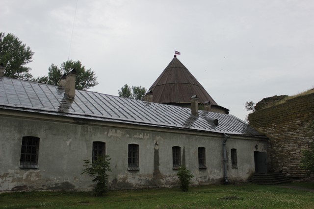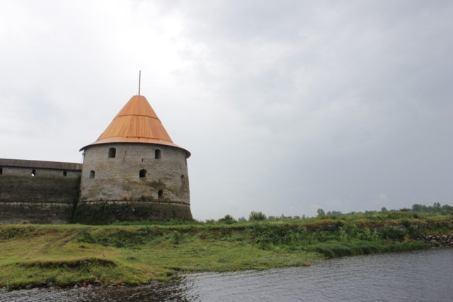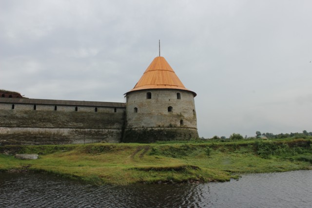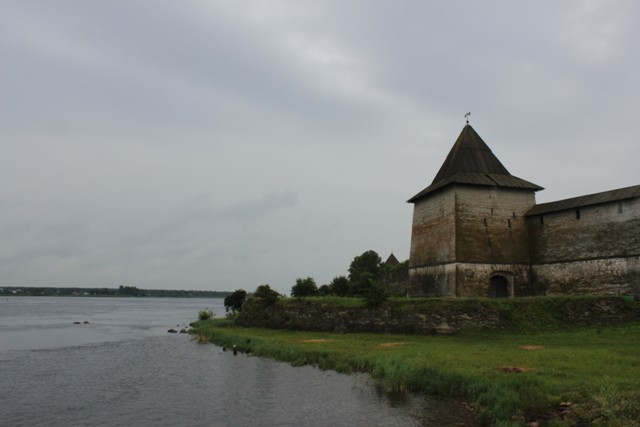 Лодка скоростная, 5 минут и мы на месте. Орешек встречает нас пасмурным темным небом и, к сожалению, дождем. Оделись мы тоже, надо сказать, не по погоде.