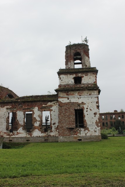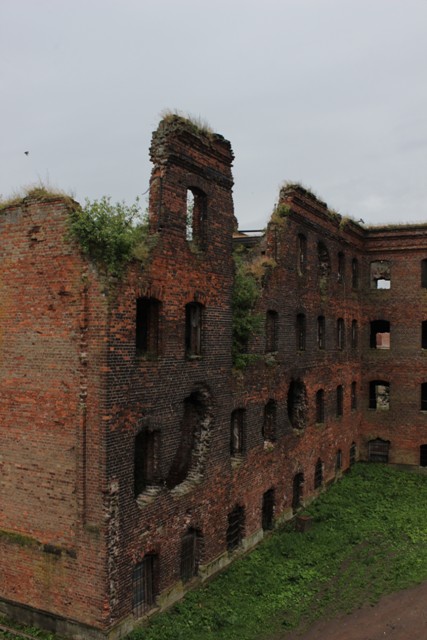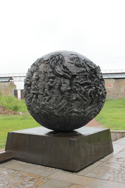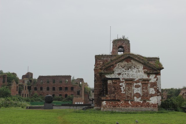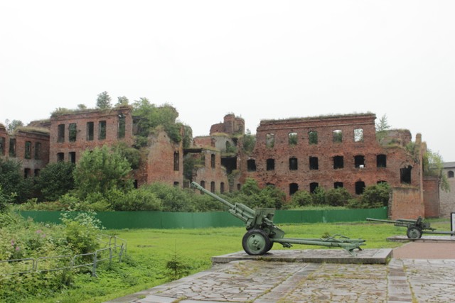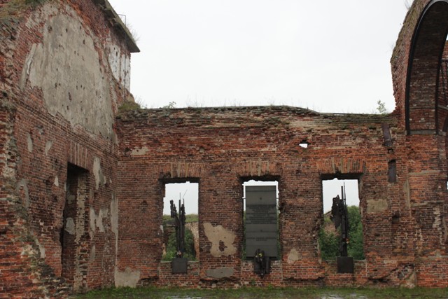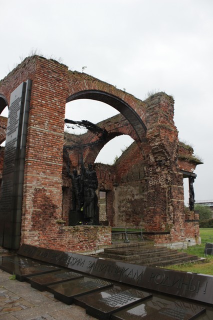 Дальше путь привел нас на огромную площадь, на которой чего только нет. Как больно, что идет дождь. Зато не холодно. В центре площади старые развалины с памятником героям ВОВ, слева здание новой тюрьмы с картинной рамой.