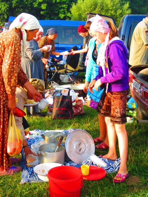 Несмотря на физическую нагрузку, а 40 км в день не шуточки), есть не хочется. Чувство голода практически не посещает, тем не менее кормят хорошо, особенно в некоторых местах. Большой выбор постной еды — вареники, супы, картошка с грибами, пирожки, соления, домашний хлеб, компоты, яблоки, арбузы. Одно «НО» к вопросу о истинной вере — зачастую люди в момент раздачи пищи превращаются в зверей. Слава Богу, что не все. По дороге в деревнях люди выставляют ведра с водой, яблоки, угощают кукурузой. Мне даже подумалось, а не попоститься ли как-нибудь. Оказывается, постная еда может быть вкусной.